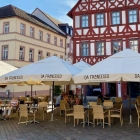 Wir freuen uns nach der Radtour auf ein leckeres Abendessen und halten auf der Hauptstraße in Karlstadt Ausschau nach zwei freien Plätzen unter den Sonnenschirmen an der Flaniermeile. Obwohl für den Abend Gewitter angekündigt sind, wollen wir es draußen versuchen, wie viele andere auch, die im Freien vor den Restaurants ihr Essen genießen.