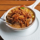 Das Schlemmertöpfle kam, ganz dem Namen nach, in einer Kasserolle, sah mit seiner Haube aus gerösteten Zwiebeln sehr verlockend aus und duftete nicht minder einladend.