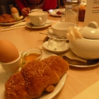 Das Frühstück entspricht dann den Erwartungen. Auch wenn es sich um aufgebackene Backwaren handelt, sind diese genießbar. Honig und Marmelade sind nicht gerade üppig portioniert, wir müssen nachordern, das ist ohne Probleme möglich, zahlen aber für eine Portion Marmelade auch 0,80€ extra. Das ist nicht gerade wenig. Der Kaffee schmeckt, könnte aber durchaus etwas heißer sein. Beim Tee ist alles in Ordnung.
