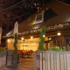 Es ist irgendwie aufgebaut wie so eine Holzhütte . Außen rum gibt es Bänke, Stühle und Tische, alles irgendwie urig gestaltet.