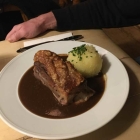 Das Schäufele hatte eine sehr schön resche Haut die richtig schön knusperte. Das Fleisch war super zart und saftig und löste sich wunderbar vom Knochen. Geschmacklich auch einwandfrei, so wie die Soße. Kräftig im Geschmack, schön eingekochte dunkle Soße und auch der Kümmelgeschmack war klasse vorhanden. Der Knödel war mit Brotkern gefühlt, allerdings in der Konsistenz sehr weich. Wir sind eher die für eine festere Konsistenz tendieren. Geschmacklich hätte man auch etwas mehr an Salz zugeben dürfen. Bestreut wurde er mit frischen Schnittlauch.