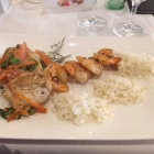 Links auf dem rechteckigen Teller lag optisch gut präsentiert ein Hähnchenbrustfilet, an das sich vier Garnelen anlehnten. Davor drei Häuflein Reis. Links beim Geflügel einige Streifen gehäutete frische Tomatenfilets. Unter dem Geflügel einige Schnipselchen grüner Spargel in etwas Sud.