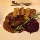 – Hirschbraten mit Pfifferlingen und Steinpilzen, Schlehensauce, Apfelrotkohl und Serviettenknödel zu 16,50 €.