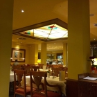 Das äußere, großbürgerliche Ambiente gibt was her und setzt sich im Restaurant fort. Ein riesiger Saal, durch hüfthohe braune Raumteiler und etliche mächtige hellgelbe Steinsäulen, die die Decke tragen, optisch unterteilt wirkend, empfängt den Gast. Durch zwei große Glasquadrate, in Holz eingefaßt und unterteilt in bunte Glasdreiecke, fällt Licht auf die zahlreichen geschmackvoll eingedeckten Tische mit den umstehenden braunen Jugendstilstühlen im Saal, ergänzt durch Licht aus LED-Strahlern in der ebenfalls hellgelben Decke. Etliche Gemälde an den Wänden lassen letztere nicht kahl wirken. Der tiefblaue, mit weißen, geometrischen Mustern aufgelockerte Teppichboden bildet einen schönen Kontrast zu den vorwiegenden Gelb- und Brauntönen.