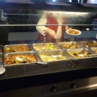Mit der Bewertung tu ich mich ein wenig schwer, einerseits war es lecker, Gemüse knackig, Fleisch, wenn grad frisch aufgefüllt, auch schmackhaft; nur Nachteil beim Essen in Buffetform ist halt, dass die ein oder andere Speise sich einfach „absteht“. Gar nicht überzeugt hat die Vorspeise, unter anderem eine Peking-Suppe, die zwar pikant, aber so dickflüssig war, dass der Löffel fast darin gestanden hat, Frühlingsrolle und Wan-Tan waren kalt. Die Nachspeise konnte gar nicht überzeugen; vom (Selbstbedienungs-) Eis habe ich nichts probiert, denn wenn um die Eis-Großpackung eine mehr oder weniger dicke Schicht aus Eiskristallen liegt, hatte die Packung vermutlich zeitweise eine falsche Kühltemperatur. Daher entschied ich mich für eine Waldmeister-Götterspeise. Dieser Wackelpudding hat nicht nur nach NICHTS geschmeckt, er war auch noch so hart als hätte er das Wackeln verlernt. Vanillesoße oder Sahne als Rettungsanker zum Verfeinern ebenfalls Fehlanzeige.