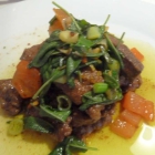 war sehr ansprechend auf drei größeren Blättern vom Blattsalat arrangiert, fein gewürzt und einem sehr guten Essig-Öl-Dressing angerichtet, das gilt auch für die Salatdekorationen. Mit den Zitronenschnitzen konnte ich die leicht säuerliche Note noch etwas erhöhen, was für mich das Tüpfelchen auf dem I bedeutete. Leider waren nicht alle Oktopus-Stücke zart, wie vorher versprochen. Einige größere Stücke mussten doch länger gekaut werden.