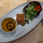 Auch die Vorspeisen ließen nicht lange auf sich warten. Die Kürbissuppe war besonders durch ihr eingesetztes Öl sehr aromatisch und gehaltvoll, ebenfalls gut umgesetzt der vielleicht etwas weiche Strudel mit gut schmeckbarem Gänsekleinanteil. Dazu ein hübsches Salatbouquet mit Frühlingszwiebeln, Kapuzinerkresseblüte und mutmaßlich selbst hergestelltem French Dressing. Den besonderen Pfiff gaben, sowohl in der Suppe wie auch im Salat verwendbare, knusprig karamellisierte Kürbiskerne. Für Madame bereits jetzt ein Volltreffer.