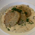 Das war schon optisch ein Sattmacher. Viel Sahne war da verarbeitet, aber es roch verlockend nach Pfifferlingen. Meine Frau war zufrieden mit ihrer Wahl. Ich habe nicht probiert, denn ich hatte genug mit meiner Vorspeise zu tun, Schottischer Räucherlachs mit Kartoffelpuffer