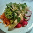 Der Salat war so, wie auch bei den Besuchen vorher erhalten: frisch, knackig, selbst hergestellt und mit einem leicht knoblauchhaltigen Dressing in einem Chicoree-Blatt serviert. Ich mag nur keine großen, lediglich halbierten Radieschen, diese blieben bei mir übrig.