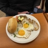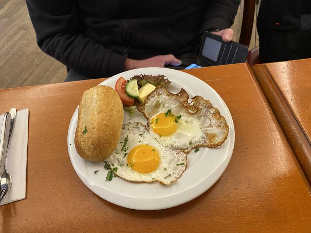 Bei den Spiegeleiern gab es leider nicht das angekündigte Brot dazu sondern auch die Semmel wie beim Brotkorb. Hier haben wir immer gerne ein rustikales Brot dazu. Bei der Aussage in der Karte dachten wir dass sich das Natur darauf bezieht weil es halt ohne Speck oder Schinken ist wie es auch angeboten wird. Aber es war auch Natur pur, ohne würze. Bei Spiegeleiern ist es aber leichter nach zu würzen . Schade dass es leider nur Streuer und keine Mühlen gab. Das eine Ei war sehr schön gebraten worden, beim anderen Ei gab es einen größeren knusprigen Rand, fasst ein wenig zu viel. Das Eigelb war bei beiden aber noch schön flüssig. Deko gab es hier auch als Salat, Gurke und Tomate. Darauf lag auch das Stück Butter.