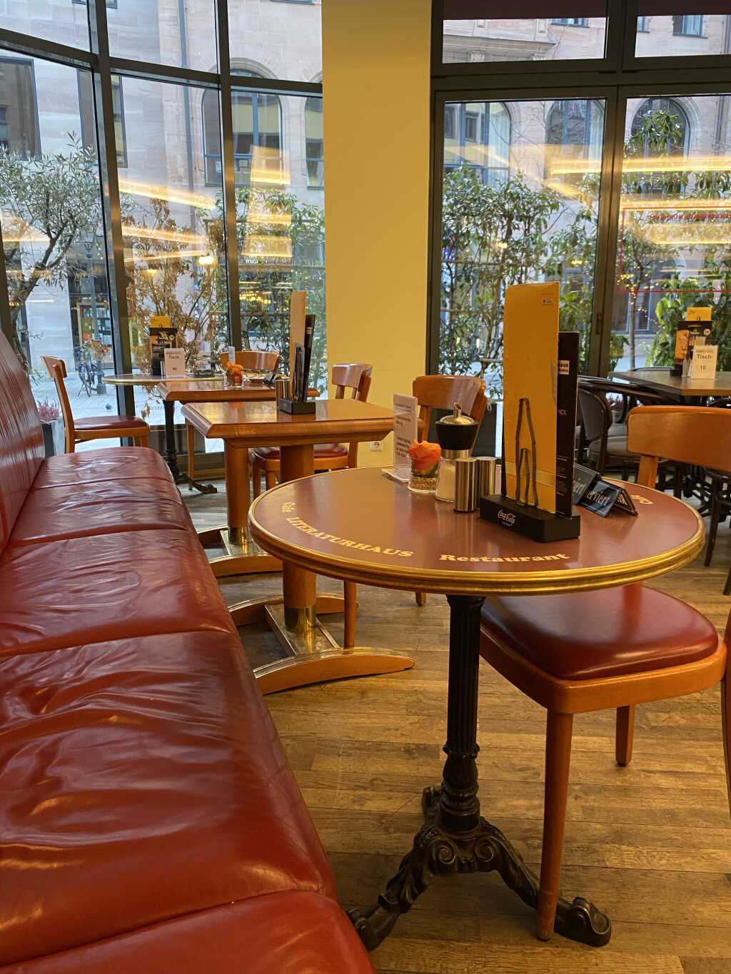 Auf dem Tisch gab es einen Ständer mit verschiedenen Karten mit Angeboten, ein Blümelchen, Salz-Pfefferstreuer und einen Zuckerstreuer. Die Tischnummer ist vorhanden und bei den reservierten Tischen gab es schon einen Teller mit Servietten und Besteck auf dem Tisch.