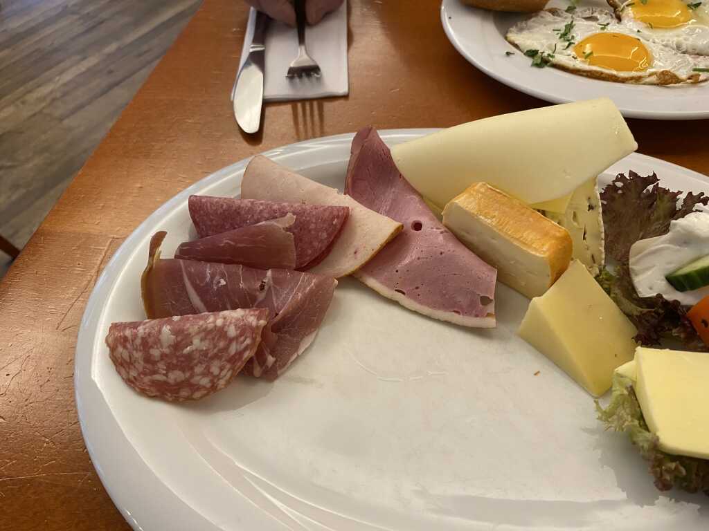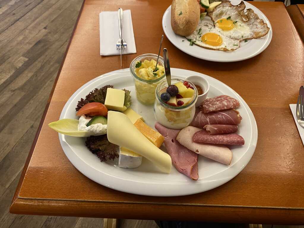 Wir hatten zwei Feldensteiner Weizen vom Fass für je 5,30 € , großes Frühstück – Serranoschinken, Salami, Braten, Fruchtaufstrich, verschiedene Käsesorten, Frischkäse, Rührei, Joghurt mit frischen Früchten, Butter und Brotkorb für 15,50 € und zwei Spiegeleier mit Butter und Brot – natur für 6,90 €