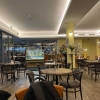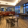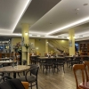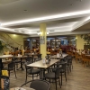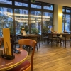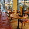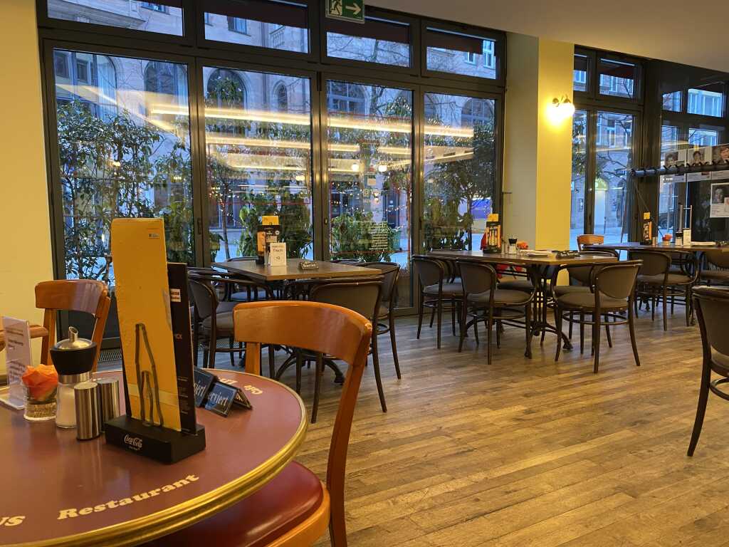 Mal gibt es eckige Tische und Stühle in Art Bistrostyle in schwarz mit grauen Sitzbezug. Im Hinteren Bereich befinden sich Holzstühle ohne Sitzkissen. Es ist alles schön hell beleuchtet.