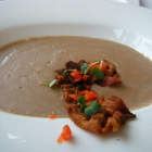 Nachdem wir den Hinweisen folgend das Restaurant durch den Haupteingang betreten hatten wurden wir sehr freundlich empfangen und nach Kontrolle der Impfbescheinigungen an unseren Tisch geführt; wir waren und blieben die einzige Gäste. Getränkewünsche wurden erfragt und die sehr überschaubare Speisekarte (3 Vorspeisen, 10 Hauptgerichte plus einer Tagesempfehlung sowie 2 Desserts) gebracht. Ihren üblichen Averna bekam meine Frau hier nicht. Als Alternative wurde ihr Cynar, der sich auf der Rechnung nicht wiederfand (hatte unsere Servicekraft Angelika Dorscheid wohl vergessen einzutippen; wir haben es erst zuhause bemerkt) serviert. Dazu bestellte sie ein kleines Teinacher Mineralwasser (0,25l EUR 2,00). Ich nahm als Starter ein kleines Karlsberg Urpils (0,25l EUR 2,50) und zum Essen einen sehr gefälligen Saar-Riesling Schiefer (0,2l EUR 6,00) vom Weingut Van Volxem. Als Vorspeise wählten wir beide die "Maronensuppe mit Coppaschinken-Chip" für EUR 6,50. Das Hauptgericht meiner Frau war "Feldsalat mit Feigen, Walnüssen und Preiselbeer-Dressing" für EUR 9,50; für weitere fünf Euro konnte dieses Gericht durch Tranchen vom Hirschrücken aufgestockt werden und wurde auch entsprechend aufgestockt. Dazu bestellte sie sich als Beilage noch "Pommes Grenaille" für EUR 3,00. Ich nahm "Gebratene Hirschrückenmedaillons unter einer Nußkruste mit dunkler Jus, Romanesco und Pommes Dauphines" für EUR 24,50.