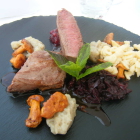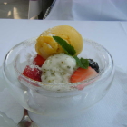 Diesmal gab es eine anderen Gruß aus der Küche, nämlich eine kleine Tranche Speckkuchen; Variation von Flammkuchen und sehr pikant. Als Vorspeise wählte meine Frau "Feurige Bananenschaumsuppe mit Curry und Kräuterscampi" (EUR 8,90). Die Suppe schmeckte sehr gut, wäre mir persönlich allerdings ein bisschen zu wenig "feurig" gewesen. Die beiden Garnelen am Spieß waren wirklich optimal gegart und sehr fein gewürzt (hier lag wohl eher das Feuer als bei der Suppe selbst). Als Hauptgericht bestellte sie "Variation vom Bodenseefisch in geschäumter Mandel-Pinienkernbutter mit Petersilienkartoffeln und Sommersalat" (EUR 28,50). Der Fisch, Bodensee-Wildfang (Felchen, Saibling und Waller), kommt immer vom Nonnenhorner Berufsfischer Kapfhammer, war perfekt gegart und schmeckte einfach fantastisch. Genau wie mein "Rehrücken rosa gegart / Pfifferlinge / Topinambur mit Apfelkraut und Eierspätzle" (EUR 33,00) wobei die "Eierspätzle", alles andere hätte mich auch gewundert, natürlich in Wirklichkeit Eierknöpfle waren. Dennoch ein rundum gelungenes Gericht. Vom Erstbesuch gewarnt liess meine Frau beim Sorbet-Dessert diesmal die "Zitrone" weg und bestellte nur das Mojito-Sorbet; auch diesmal wieder sehr gelungen. Für "Essen und Trinken" trotz der beiden kleinen Ausrutscher viereinhalb Sterne..