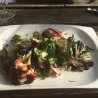 Ich sagte nach dem Verzehr nicht Muuh, sondern Jam! Lecker! Dieses Gericht ist ja inzwischen auf allen möglichen Restaurant Karten ein Klassiker, und ich mag die Kombination ausnehmend gerne. Der Frischkäse war sehr sanft, vermutlich ein Kuhmilchkäse, ich habe das aber nicht erfragt. Drum herum krosser Speck. Unten drunter ein tadellos frischer Salat mit einer gut abgeschmeckten fruchtigen Vinaigrette. Für und Beide ein guter Start in das Abendessen.