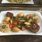 Optisch und für meine Nase war das schon mal ansprechend. Interessant der Look der Sauce Hollandaise, die war sicher hausgemacht, sowas kann man kaum kaufen! das sah nach einer Senfsauce aus. Aber eine Gabelprobe ergab, dass hier ganz sicher sehr viel Butter im Spiel war. Zusammen mit der Nuss das bestimmende Aroma. Äußerst lecker das Gemüse, Ruccola und Tomaten angeschwenkt. Sehr interessant der offensichtlich in karamelliertem Zucker gebratene Spargel. Die beiden Filetstücke waren ohne Tadel gut gebraten, saftig, leicht rosa im Inneren. Ein sehr leckeres Gericht im Ganzen.