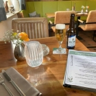 Die Küche auch hier sehr saisonal und regional ausgerichtet, vielleicht etwas umfangreicher und anspruchsvoller als am Abend vorher in Wenholthausen bei Seemer, sie lässt sich auf der Homepage einsehen. Ich orderte erst einmal ein großes Bier und löschte meinen Durst, bis dann auch meine Frau am Tisch eintraf. Zusammen studierten wir die Karten. Recht schnell war eine Auswahl getroffen und bestellt. Die Küche begrüßte uns mit einem Kartoffelpuffer und Apfelmus