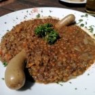 Bald vibrierte der Pager und die zuvor bestellten Wurstspeisen konnten nach angenehmer Wartezeit abgeholt werden. Meine Frau war im Begriff, sich einen deftigen, mit ordentlicher Gemüseeinlage gekochten Linseneintopf mit wahrnehmbarer Essignote und einer kapitalen Knackwurst (13,90 Euro) einzuverleiben,