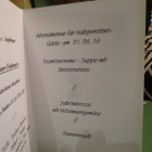 Im Rahmen der Halbpension gab es jeweils ein dreigängiges Menu, das täglich wechselnde Programm lag jeweils in einer Klappkarte auf den Tischen aus (siehe Bild). An diesem Abend wurde uns angekündigt: Tomatencremesuppe mit Brotcroutons, Saltimbocca mit Mittelmeergemüse und Bananensplit.