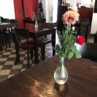 Am Platz stand jeweils eine Vase mit leicht ermüdeten Schnittblumen.