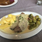 Die Rinderbrust war butterweich, sehr zart und saftig. Man konnte sie richtig zerpflücken. Die Meerrettichsoße dazu gab einen wunderbaren Geschmack mit dazu ab, leicht cremig, sehr schön abgeschmeckt mit einer Klasse Meerrettichnote, aber nicht zu ras. Es befanden sich auch Meerrettichstreifen in der Soße mit drinnen. Wir hätten gerne noch etwas frischen mit dazu gehabt zum nachschärfen. Die Salzkartoffeln waren auf den Punkt gegart, eine sehr gut schmeckende Kartoffelsorte und sie waren in ausreichend Salzwasser gegart worden. Der Rosenkohl hatte einen wunderbaren Geschmack nach Kohl , war aber leider sehr weich gekocht. Dazu gab es noch angebratene Speckwürfel die auch einen schönen Geschmack hatten.