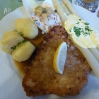 Nach einer der frischen Zubereitung angemessenen Wartezeit brachte die Bedienung die Teller mit unseren Essen und wünschte „Guten Appetit“. Beide Schnitzel hatten eine anständige Größe, sahen gut aus und waren deutlich heiß. Die Pommes frites auf dem Teller meines Kollegen sahen gut aus und waren offensichtlich frisch zubereitet, während meine Kartoffeln einige schon etwas trockene Stellen aufwiesen. Die drei Stangen Spargel, obwohl von großem Durchmesser, erschienen mir für diese Portion etwas knapp, waren aber auf den Punkt gegart und schmeckten entsprechend gut. Die Sauce Hollandaise darauf war sehr gut und ich dachte schon an selbst zubereitet, aber die Bedienung gab dann später im Gespräch zu, dass es sich um Convenience-Ware handelte.