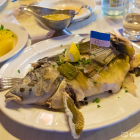 - Der Zanderfilet meliert und schön goldgelb in Butter in der Pfanne herausgebacken, etwas unspektakulär angerichtet, jedoch wirklich frisch und nicht zu lang erhitzt. Die Pommes frisch und knackig, schön sparsam gesalzen und nicht fettig. Allerdings die reichliche Sauce ohne Erinnerungscharakter mit convenience Helferlein.
