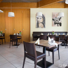 Dunkelbraune Holzstühle mit Lederpolsterung an quadratischen, ebenfalls dunklen Holzimitat-Tischen mit rustikaler Oberfläche. Eingedeckt mit Papierservietten und frischen Blumen als Deko. Ansonsten helle Farben bei Bodenfließen, Wand und Holztrennwand zum Nebenraum. Drei großformatige Bilder an den Wänden, von denen nur eines direkt Italien zuzuordnen ist. Eine etwas kühle und nüchterne Raumausstattung.