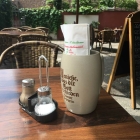Der größte Bereich ist noch zusätzlich mit Schirmen ausgestattet. Bringt Schatten und es fällt auch nichts von den Bäumen ins Glas oder Essen. Es gibt auch einen Aufsteller mit Tagesgerichten.