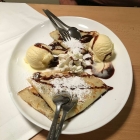 Diesmal sollte es noch zur Manowar Nachspeise ein Palatschinken sein. Wir bekamen auch zweimal Besteck mit dazu. Ein fluffiger, lockerer Pfannkuchen mit einer zarten süße, lecker. Die Schokolade kam uns allerdings als Fertigprodukt vor. Sie war einfach nur extrem süß. Der Pfannkuchen wurde noch mit Puderzucker bestreut. Die wie wir denken fertige Sprühsahne ist auch so was das wir nicht brauchen. Das Eis ist jetzt nicht selbst gemacht, aber das ist hier wohl jedem klar. Es war jetzt aber nicht von der schlechten Sorte die man so bekommt.
