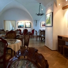 Der Gastraum erinnert an ein großes Wohnzimmer mit mehreren runden Tischen und umstehenden Stühlen, alles in dunklen Brauntönen gehalten, die Stühle mit gesticktem Gobelinbezug. Die weißen Wände sind mit zahlreichen Bildern behängt, die käuflich erworben werden können.
