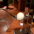 Während wir die Karten studierten (mit Leihbrille des Restaurants für die im Auto vergessene eigene), wurden uns auf Probierlöffeln je eine in Reis(?)-Perlen gewälzte Ziegenfrischkäse-Praline gereicht