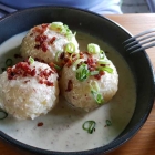 Meist werden ein oder zwei große Klöße serviert. In der Werkstatt wurden drei kleinere Exemplare gerollt. Klöße und Sauce schmeckten meinem Bruder ausgezeichnet.
