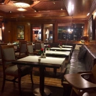 Von hier aus überblicken wir den Gastraum. Die Decke und die Wände sind in dunklem Braun holzvertäfelt. In die Wände sind Vitrinen eingelassen, in denen Luxusartikel ausgestellt sind, die im Hotel erworben werden können. Farblich passend zur Decke und zu den Wänden sind die dunkelbraunen Tische und die mit Streifenmustern bezogenen braunen Stühle. Der ebenfalls braune Parkettfußboden ist teilweise mit Teppichen belegt.