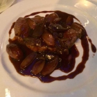 Optisch verwirrt der Teller meiner Frau. War es der Chef de Partie, der Commis de Cuisine oder gar der Chef de Cuisine, der das Rumpsteak dreigeteilt und Schalotten und Fleisch mit einer Sauce übergossen hat, die alles einerlei erscheinen läßt? Doch im Geschmack zeigt sich eine Meisterleistung. Das Steak ist auf den Punkt gebraten, medium, wie es meine Frau gewünscht hat. Es ist so zart und die Rosa-Färbung im Innern so gleichmäßig bis auf einen geschätzten Millimeter an den Außenrand des Steaks ausgedehnt, daß meine Frau eine Sous-Vide-Zubereitung vermutet. Die Schalotten mit der Sauce schmecken ihr ausgezeichnet. Der Geschmack der Sauce verrät, dass sie mit Rotwein zubereitet ist. Die Süßkartoffelpommes sind vorbildlich frittiert, knusprig und gut gewürzt.