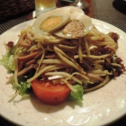 Sie kamen dann doch noch. Der Balsamico duftete mir schon entgegen. Dann mal ran ans Peugeot-Mahlwerk und ein wenig nachgepfeffert. Der Emmentaler-Käse und der Kochschinken waren ganz fein geschnitten. Die ungeliebte Salatgurke ließ ich schon im Voraus gar nicht erst auf dem Teller erscheinen. Das in Scheiben geschnittene hartgekochte Ei und die Tomatenstücke durften dagegen nicht fehlen. Dazu gab es einen Korb mit kleinen, frisch aufgebackenen Pizzabrotkugeln. Schade nur, dass es sich dem Geschmack nach zu urteilen wohl eher um eine Fertigsalatmischung aus der Tüte handelte. Frisch schmeckt der nicht nur anders, sondern auch um einiges besser. Aber wir waren ja nicht wegen dem Salat nach Bellheim gefahren, sondern mit eindeutiger Pizza-Absicht.
