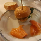 Als nächstes musste der Rehburger dran glauben. Diesen umgarnte ich mit etwas Lachs und Weißbrot. Zwei Bissen und der Rehburger war in meinem Magen verschwunden. Man konnte den Rehgeschmack auf der Zunge spüren, die Verbindung mit dem Preiselbeersenf fand ich durchaus gelungen. Auch das Bun war in Ordnung. Danach noch etwas Lachs, dazu das köstlich frische Brot. Da ich mir immer nur kleine Portionen zurechtmachte, war hier auch ein zweimaliger Nachschlag fällig.