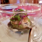 Das Amuse wurde in einem feinen Glasobjekt serviert, das mich immer an eine halbierte Drachenfrucht oder einen aufgeschnittenen Seeigel erinnert.