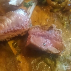 Das Lamm sündhaft zart und aromatisch, die Dattel-Rosinen-Sauce ein geschmackliches Highlight. Die Rosmarinkartoffeln dazu der Wahnsinn. Außen knusprig (schöne Butterkruste) innen kartoffelig weich. Das Rumpsteak war wie gewünscht:
