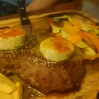 Schön medium, innen war es fast medium rare (roh), aber die Struktur des Fleisches war der Wahnsinn. Die Kräuterbutter dazu, ein Genuss mit jedem biss. Das Gemüse leicht ölig, den Pommes hat es etwas an Salz gefehlt. Etwas Salz fehlte auch bei dem Gericht von meiner Frau.