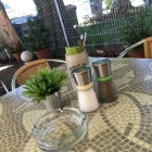 Auf dem Tisch gibt es ein künstliches Blümelchen und einen Aschenbecher ohne Windschutz. Dazu kam dann noch ein Krug mit Besteck und grünen Servietten und Salz-und Pfeffermühlen. Im Hintergrund hörten wir dezent Bayern 1 laufen