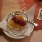 Ja, die fruchtige Beilage. Dosenpfirsich und Preiselbeeren aus dem Glas. Ich hab's mal probiert, ließ es am Ende aber weiter unberührt. Man muss ja nicht immer alles essen. Die Hoffnung ruhten auf dem Hirsch. Der war dann auch das Beste am Gericht. Mürbe gegart und noch nicht zu trocken, kaum Fett und schön kräftig im Geschmack. Drei ordentliche Scheiben waren auf dem Teller, begossen mit reichlich „Rahmsauce“, die ursprünglich eher pulvriger Natur war. Schmeckte stumpf, wenig „rahmig“ und machte nur bedingt Spaß. Dafür waren die Kartoffeln leider zu trocken, wenn auch geschmacklich in Ordnung. Das Rotkraut wurde im Ring angerichtet, wohl selbstgemacht aber auch ewig lang gekocht und hatte somit kaum noch Struktur. Auch ohne Gebiss essbar. Geschmacklich ausbaufähig. Ein Salatblatt mit Gurken- und Orangenscheibe brachten noch etwas Farbe auf den Teller. Ich war am Ende satt, das zählte, aber das war nix wofür ich wieder kommen würde. 2*