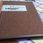Die Speisekarte hat einen Filzeinband mit Logo drauf und wird an der Seite von einer Holzleiste zusammen gehalten.