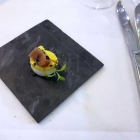 Das Highlight des Menues. Ausgelöstes, butterzart geschmortes Rippchen darauf eine medium-well gegarte Scheibe Filet von angeblich glücklichen, weil freilebenden und bis zu 20 Jahre alten Oma-Kühen aus dem spanischen Baskenland. Aroma und Textur sind schon etwas Besonderes, wie unsere Freundin meinte schmeckt es so richtig nach Tier. Eine Parallele zu anderen Rindfleischqualitäten kann ich nicht ziehen, weil es sich um einen eigenen Geschmack handelt. Die Beilagen dazu passend, die intensive Jus mit leichter Essignote oder war‘s der Aspik? Der Acker bestand aus drei geschichteten Pürees (Kartoffel, Broccoli und Karotte). Nett auch die kleinen Krapfen-Kugeln und die eingeweichten Morcheln.