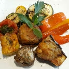 Gebratenes Gemüse wie Paprika, Tomate, Zucchini, Obergine ich Scheiben bzw. Stücken und vier kleine „Päckchen“ gebraten oder frittiert mit einer krossen Hülle bildeten den Kern des Tellers. Vermutlich waren in den kompakten Formen im Inneren Mozarella-Stücke bzw. Blumenkohl-Späne verarbeitet worden. Also Dekoration gab es noch ein paar Salatblätter.