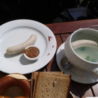 Meine Principessa nahm heute ein Paar Weißwürste mit süßem Senf und einer frischen Breze (6,90 Euro). Stilecht dargereicht ein einer kleinen Terrinne heißen Wassers mit einem Strunk Petersilie drin. Das findet man selten vor.