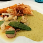 Der Meister der grünen Sauce hielt auch beim Fischgang die Kräuterkelle hoch und servierte uns eine abgewandelte, wesentlich leichtere Version seiner grünen Wellnesstunke – diesmal als leicht aufgeschäumte Begleitung zum Schuppentier.