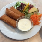 Die Karte ist sehr klein und überschaubar und wird ergänzt durch ein jeweiliges Tagesgericht. Da wir uns umorientieren mussten, wählten wir den Grillteller (11,80 €) mit Pommes und Salat und die knusprigen Kartoffelkissen (7,80 €) mit Salatbouget. Das Essen war eigentlich soweit rundum in Ordnung, aber durch den Missmut der Servicekraft war uns der Appetit vergangen. Wir hätten eigentlich gleich wieder gehen sollen.