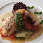 Der erste Gang! Was für ein Hingucker! Das Cobiafilet roh und wohl „Ceviche“, mit Zitronensaft mariniert, zubereitet. Das Thunfischfilet bester Qualität ebenfalls roh mariniert. Mittig findet sich der Wakame-Algensalat in bester Gesellschaft an einem Salatbouquet mit frischem Bärlauch und Wiesenkerbel aus dem Garten. Forellenkaviar, Erbsensprossen, schwarzer Sesam und ein fantastisches Ingwergelee mit rosa Pfefferbeeren fanden sich auch noch auf dem Teller ein.